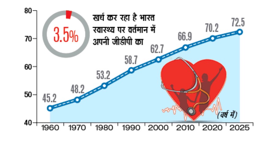 देश की आजादी के समय भारतीयों की औसत आयु 40 वर्ष से कम थी। स्वास्थ्य सुविधाओं की उपलब्धता बहुत कम थी। समय के साथ स्वास्थ्य सुविधाओं का विस्तार हुआ। लोगों का जीवन स्तर बेहतर हुआ और आज भारतीयों की औसत आयु 70 वर्ष से अधिक है।
