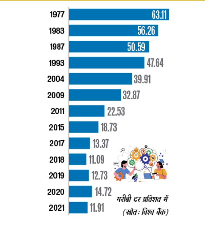 1947 में देश की आजादी के समय भारत में गरीबी और असमानता का बोलबाला था। जरूरतें पूरी करने के लायक अनाज का उत्पादन भी नहीं होता था। भूमि सुधार, हरित क्रांति और उदारीकरण के साथ आज देश में गरीबी अपने न्यूनतम स्तर पर है।