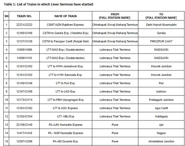 रेलवे बोर्ड ने कहा है कि इन चीजों की सप्लाई शुरू कर दी गई है। कंबल और बेडशीट ना मिलने के चलते लोग इसकी काफी मांग कर रहे थे। ये सुविधाएं ना मिलने की वजह से लोगों को काफी दिक्कत हो रही थी। बहुत से ऐसे भी लोग थे, जो ट्रेन में ये सब सुविधाएं ना मिलने की वजह से परेशान थे। रेलवे ने 638 ट्रेनों की सूची जारी कर कहा कि इन ट्रेनों में लिनन सेवाएं (बेडशीट, कंबल और पर्दे की सुविधा) शुरु कर दी गई है। इसके अलावा जिन ट्रेनों यह सुविधा नहीं है उसमें यात्री को स्वयं व्यवस्था करनी होगी।