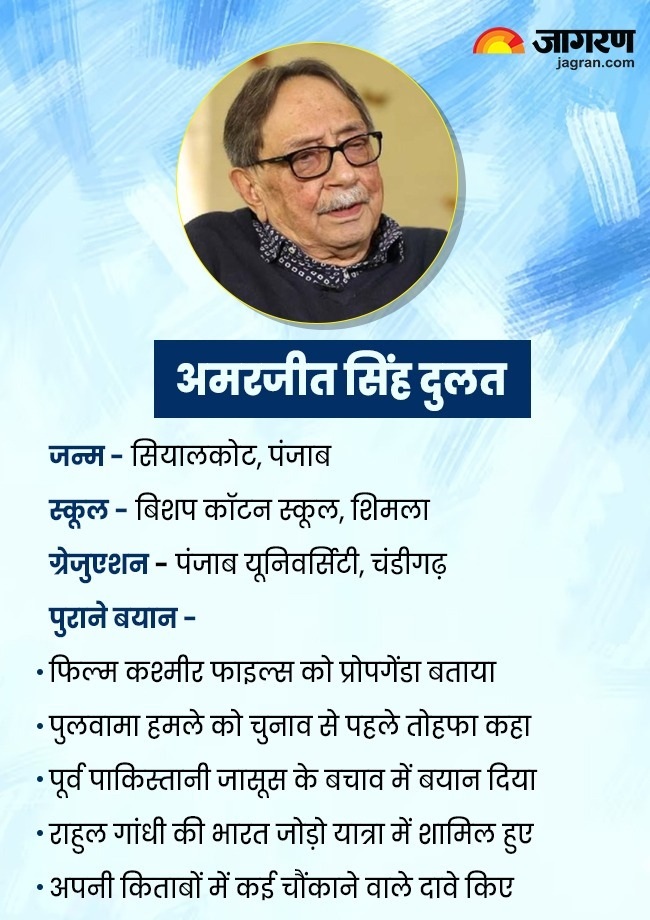 - अमरजीत सिंह दुलत अपने कार्यकाल के दौरान जितना कभी चर्चा में नहीं रहे होंगे, उससे ज्यादा रिटायरमेंट के बाद रहे हैं। दुलत ने एक बार हैदराबाद में आयोजित एक कार्यक्रम में पुलवामा हमले को लोकसभा चुनावों से पहले भाजपा के लिए एक तोहफा बताते हुए कहा था कि इसने भारत को पाकिस्तान के आंतकी शिविरों पर सर्जिकल स्ट्राइक करने का अधिकार दे दिया था।