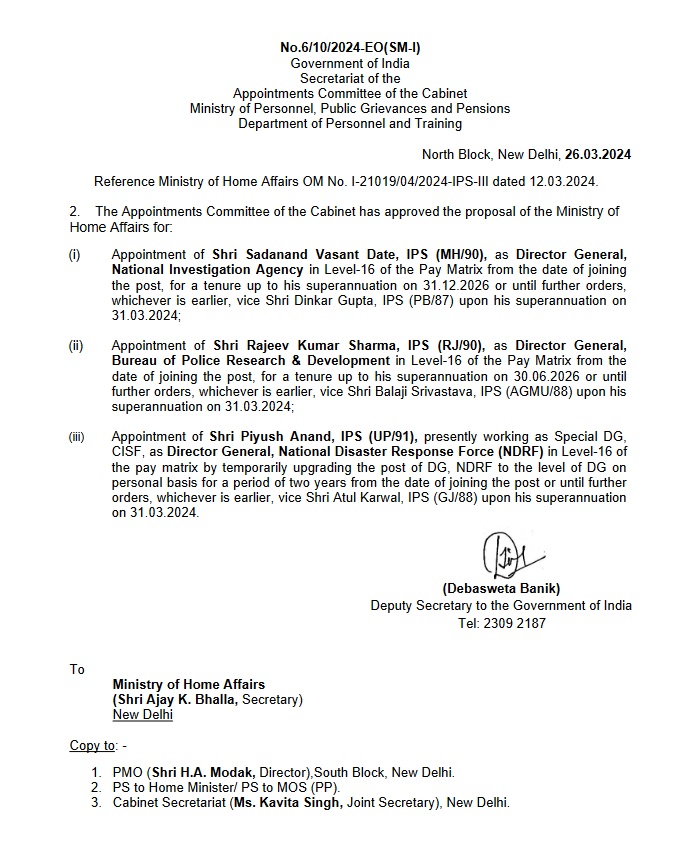 IPS सदानंद वसंत बने NIA के डीजी, पीयूष आनंद को बनाया गया NDRF का महानिदेशक