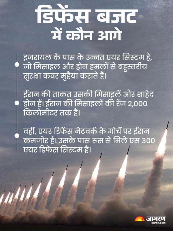 इजरायल के पास के उन्नत एयर सिस्टम है, जो मिसाइल और ड्रोन हमलों से बहुस्तरीय सुरक्षा कवर मुहैया कराते हैं। ईरान की ताकत उसकी मिसाइलें और शाहेद ड्रोन हैं। ईरान की मिसाइलों की रेंज 2,000 किलोमीटर तक है।