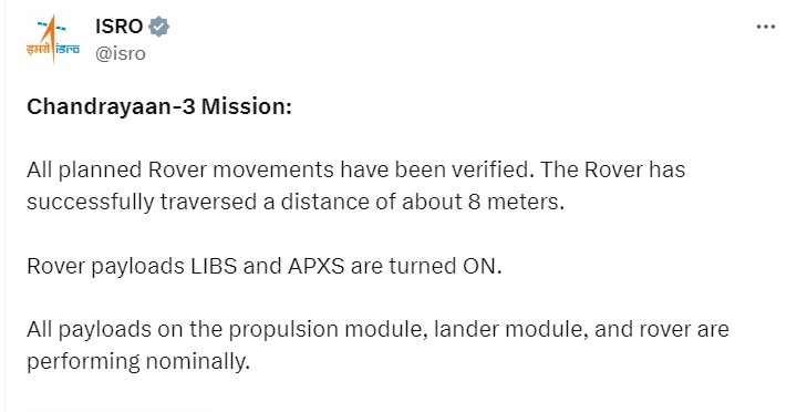 इसरो लगातार रोवर प्रज्ञान से जुड़े अपडेट्स को दुनिया से साझा कर रहा है। इसी बीच इसरो (ISRO) ने शुक्रवार को बताया कि चंद्रमा पर रोवर प्रज्ञान ने 8 मीटर की दूरी सफलतापूर्वक तय कर ली है। रोवर से जुड़े पेलोड LIBS और APXS चालू हैं।
