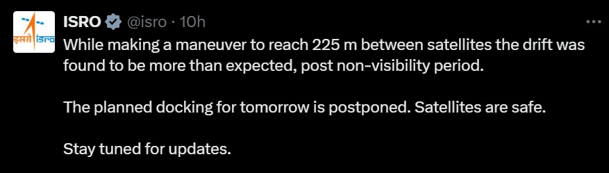 इसरो ने डॉकिंग के प्रयोग के स्थगन की जानकारी एक्स पर पोस्ट करके दी। इसरो जानकारी दी कि उपग्रहों के बीच 225 मीटर की दूरी तक पहुंचने के लिए अभ्यास के कुछ खामी देखी गई। कल के लिए नियोजित डॉकिंग प्रक्रिया स्थगित कर दी गई है। उपग्रह सुरक्षित हैं।