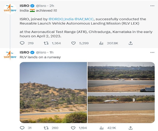 इस रीयूजेबल लॉन्च व्हीकल ऑटोनॉमस लैंडिग मिशन को आज सुबह कर्नाटक के चित्रदुर्ग के एटीआर से संचालित किया गया। सुबह 7 बजकर 10 मिनट पर RLV ने उड़ान भरा और 7.40 बजे यह एटीआर एयर स्ट्रीप में लैंड किया।