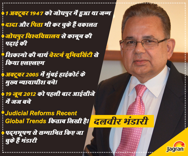 19 जून 2012 को पहली बार इंटरनेशनल कोर्ट ऑफ जस्टिस के सदस्य के रूप में दलवीर भंडारी ने शपथ ली थी। आईसीजे से पहले भंडारी कई कोर्ट में उच्च पद पर काम कर चुके है। भंडारी को पद्मभूषण से सम्मानित भी किया जा चुका है। वह न्यायिक प्रणाली में सुधार को लेकर और विश्व में हो रहे बदलावों को देखते हुए एक किताब भी लिख चुके हैं। इसका नाम 'ज्यूडीशियल रिफॉर्म्स: रीसेंट ग्लोबल ट्रेंड्स' है।