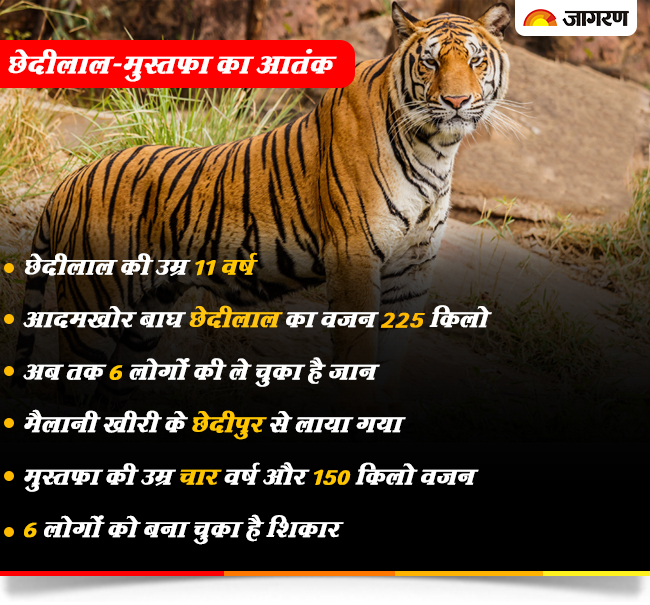 नई दिल्ली [ स्पेशल डेस्क ]। एक की उम्र 11 वर्ष और दूसरे की उम्र चार वर्ष है। लेकिन इनके इरादे बहुत ही खतरनाक। हमेशा किसी न किसी को शिकार बनाने की फिराक में रहते थे। ये दोनों अपने इरादों को अमलीजामा भी पहना चुके हैं। मौका लगते ही वो लोगों को निवाला बना लेते हैं। लेकिन उनके मंसूबों पर लगाम लगाने की कोशिश की जा रही है। अब वो सिर्फ भड़केंगे,दहाड़ेंगे लेकिन चिड़ियाघर की चारदीवारी उनके पैरों पर बंधन लगाने का काम करेगी। चलिए,अब सस्पेंस से पर्दा उठाते हैं। छेदीलाल और मुस्तफा नाम के आदमखोर बाघ मैलानी खीरी और पीलीभीत के लोगों के लिए आतंक का पर्याय बन चुके थे। जहां एक तरफ अब तक छेदीलाल 6 लोगों को अपना निशाना बना चुका है, वहीं चार वर्ष का मुस्तफा भी छेदीलाल से कम नहीं निकला। मुस्तफा ने भी 6 लोगों का शिकार किया है।