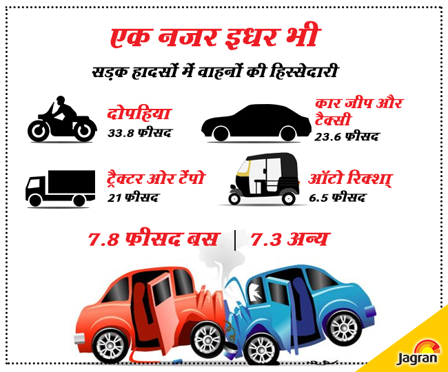 जैन की इस बात की तसदीक कहीं न कहीं आंकड़े भी करते हैं। आंकड़े बताते हैं कि सड़क हादसों में ज्यादातर शिकार होने वालों में दोपहिया वाहन ही हैं। यह करीब 38 फीसद हैं। वहीं दूसरे नंबर पर कार, जीप और टैक्सी हैं, जो करीब 23.6 फीसद है। तीसरे नंबर पर ट्रक, ट्रैक्टर ओर टेंपो हैं जो करीब 21 फीसद है। इनके बाद ऑटो रिक्शा, बस और अन्य वाहन आते हैं, जो कुल 21 फीसद हैं।