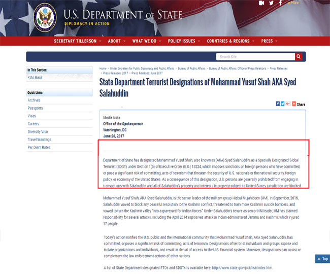 यूएस स्टेट डिपार्टमेंट अंडर एग्जीक्यूटिव ऑर्डर 13324 के तहत सैयद सलाहुद्दीन को स्पेशल डेजिग्नेटेड ग्लोबल टेररिस्ट घोषित किया गया। इस आर्डर पर सितंबर 2001 में अमेरिका के तत्कालीन राष्ट्रपति जॉर्ज डब्ल्यू बुश ने हस्ताक्षर किए थे। वाशिंगटन के दी विलार्ड होटल में पीएम मोदी और अमेरिका के विदेश मंत्री और रक्षा मंत्री की मुलाकात के बाद ये अधिसूचना जारी की गई।