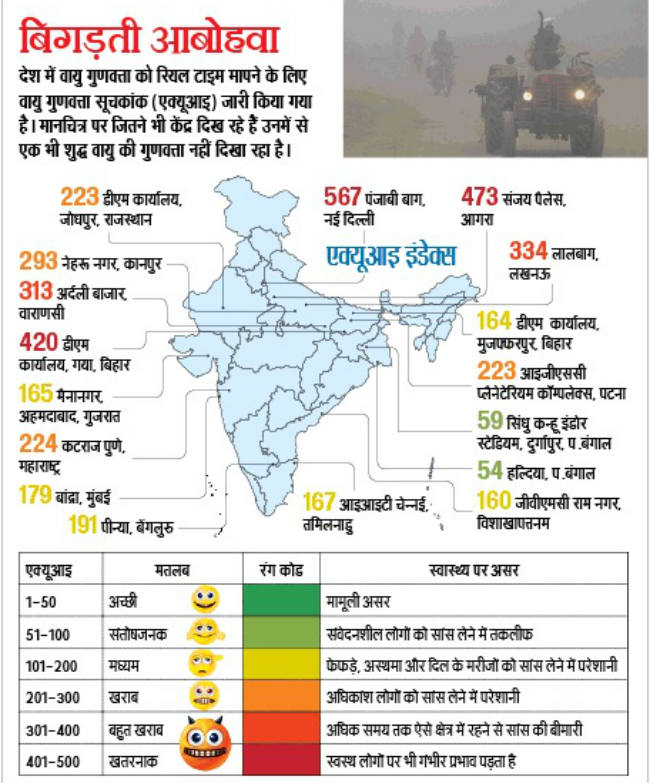 वायु प्रदूषण की काली धुंध में मेरठ का दम घुट रहा है। यहां पर हवा की गुणवत्ता दिल्ली से भी खराब मिली है। जहां दिल्ली में पार्टिकुलेट मैटर (पीएम-2.5) की औसत मात्रा 400 माइक्रोग्राम प्रति घन मीटर है, वहीं मेरठ में तमाम स्थानों पर सात से आठ सौ माइक्रोग्राम प्रति घन मीटर मिला। चिकित्सकों का दावा है कि हर तीसरे व्यक्ति पर दमा का खतरा है। औद्योगिक सेक्टर में पेटकॉक और फर्नेस आयल का ईंधन के रूप में प्रयोग हो रहा है। कानपुर का प्रदूषण दिल्ली को टक्कर दे रहा है। केंद्रीय प्रदूषण नियंत्रण बोर्ड के वायु गुणवत्ता सूचकांक में कानपुर प्रदेश का पांचवां सबसे प्रदूषित शहर हो गया है। बीते गुरुवार को (पीएम 2.5) 436 माइक्रोग्राम प्रति घन मीटर रिकार्ड किया गया। इसका मानक 60 माइक्रोग्राम प्रति घन मीटर होता है।