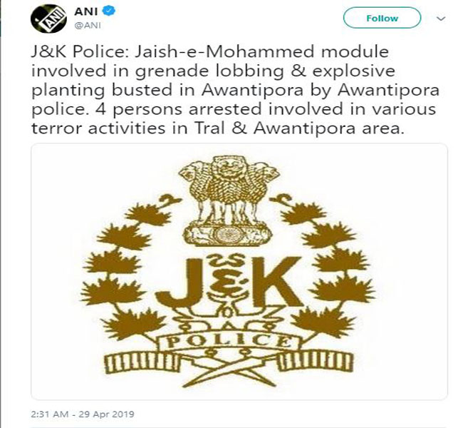 अवंतीपोरा में जैश के बड़े मॉड्यूल का भंडाफोड़, चार संदिग्ध गिरफ्तार