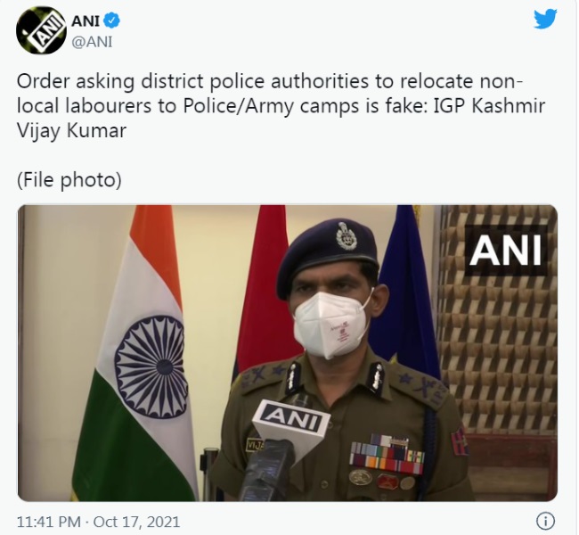 नई दिल्ली, एजेंसियां/जेएनएन। आतंकियों ने कश्मीर में 24 घंटे के भीतर प्रवासी मजदूरों पर तीसरा हमला किया। रविवार शाम को दक्षिण कश्मीर के कुलगाम में आतंकियों ने एक घर में घुसकर अंधाधुंध गोलीबारी की जिसमें बिहार के दो श्रमिकों की मौके पर ही मौत हो गई जबकि एक गंभीर रूप से घायल हो गया। इस बीच समाचार एजेंसी पीटीआइ ने एक एडवाइजरी जारी होने की रिपोर्ट दी जिसमें गैर स्थानीय मजदूरों को नजदीकी सुरक्षा शिविरों में लाए जाने की बात कही गई थी। इसके कुछ ही देर बाद समाचार एजेंसी एएनआइ ने कश्मीर के IG विजय कुमार बयान ट्वीट किया। इसमें IG विजय कुमार ने उक्त एडवाइजरी को फेक बता दिया।