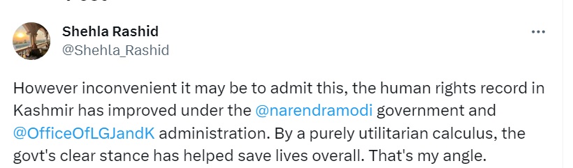 स्वतंत्रता दिवस के दिन उन्होंने अपने X हैंडल (ट्वीट) के जरिए कहा,"इस बात को स्वीकार करने में भले ही हैरानी हो रही है, लेकिन कश्मीर में मानवाधिकार रिकॉर्ड में सुधार हुआ है। नरेंद्र मोदी सरकार और जम्मू कश्मीर प्रशासन ने घाटी में लोगों की जान बचाने में मदद की है। यही मेरा दृष्टिकोण है।