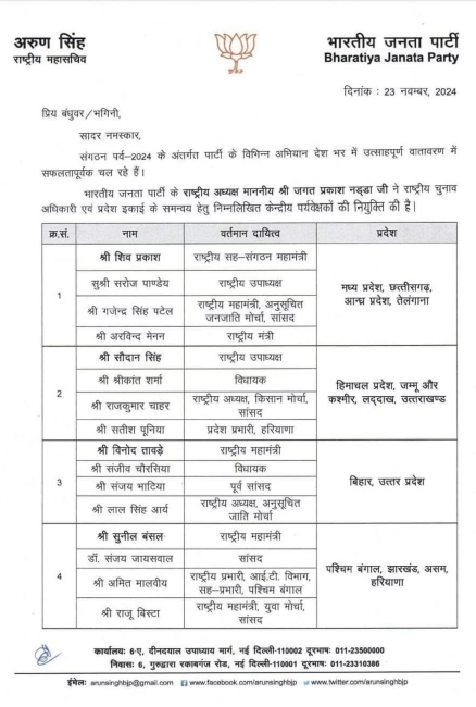 वहीं, शिवप्रकाश को मध्य प्रदेश, छत्तीसगढ़, आंध्र प्रदेश व तेलंगाना की जिम्मेदारी दी गई है। अरुण सिंह को महाराष्ट्र, गोवा, दमन द्वीप के साथ ही दादर नगर हवेली की जिम्मेदारी दी गई है। राजस्थान, पंजाब, चंडीगढ़ और गुजरात का पर्यवेक्षक राधा मोहन दास को बनाया गया है।