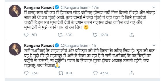 बुधवार को कंगना ने ट्वीट कर लिखा कि रानी लक्ष्मीबाई के साहस, शौर्य और बलिदान को मैंने फिल्म के जरिए जिया है। दुख की बात यह है मुझे मेरे ही महाराष्ट्र में आने से रोका जा रहा है। मैं रानी लक्ष्मीबाई के पद चिन्हों पर चलूंगी ना डरूंगी, ना झुकूंगी। गलत के खिलाफ मुखर होकर आवाज उठाती रहूंगी, जय महाराष्ट्र, जय शिवाजी। दूसरे ट्वीट में उन्होंने लिखा कि मैं बारह साल की उम्र में हिमांचल छोड़ चंडीगढ़ हॉस्टल गयी, फिर दिल्ली में रही और सोलह साल की थी, जब मुंबई आई। कुछ दोस्तों ने कहा, मुंबई में वही रहता है जिसे मुम्बादेवी चाहती है। हम सब मुम्बादेवी देवी के दर्शन करने गए, सब दोस्त वापस चले गए और मुम्बादेवी ने मुझे अपने पास रख लिया।