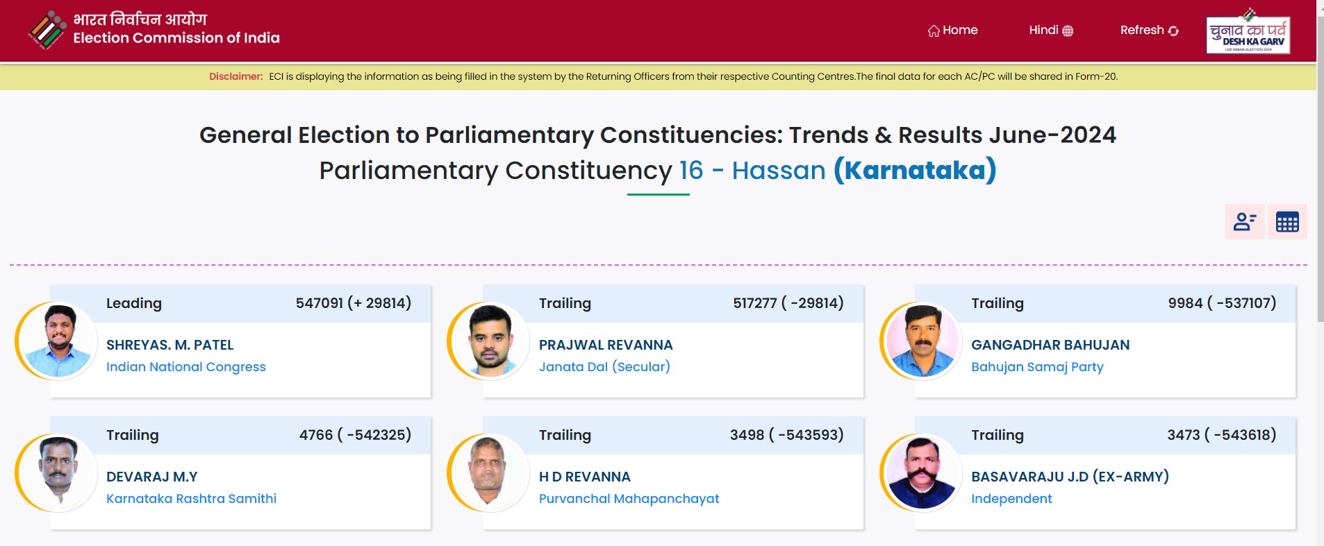 चुनाव आयोग द्वारी जारी आंकड़ों के मुताबिक, प्रज्वल रेवन्ना कांग्रेस उम्मीदवार श्रेयस एम. पटेल से 29814वोटों से पीछे हो गए हैं। दोपहर 12 बजकर 54 मिनट तक प्रज्वल रेवन्ना को कुल 517277वोट, जबकि कांग्रेस उम्मीदवार श्रेयस एम. पटेल को 547091 वोट मिले हैं।
