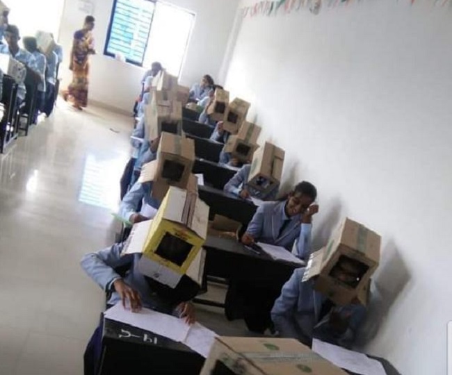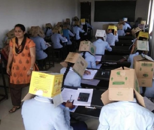 कर्नाटक के हावेरी स्थित भगत प्री यूनिवर्सिटी कॉलेज में बच्चे नकल ना कर सकें इसलिए उनके सिर पर गत्ते के डिब्बे पहना दिए हए। ये गत्तों के डिब्बों सामने की तरफ खुले हुए थे। जिससे बच्चे देख सकें और अपना पेपर लिख सकें।