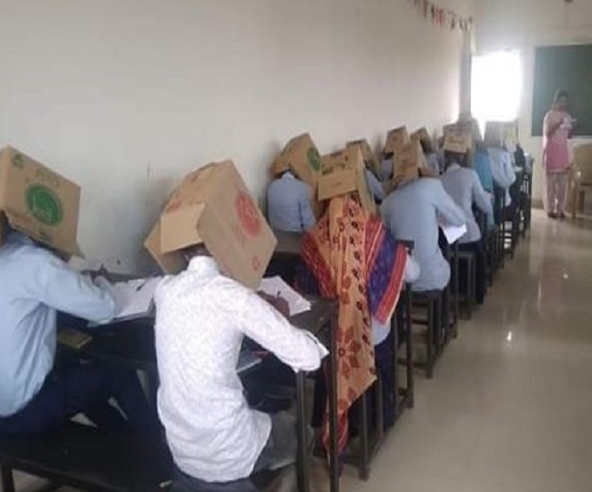 Viral Photo: परीक्षा में छात्र ना कर पाए नकल, कॉलेज ने बच्चों के सिर पर पहना दिए गत्ते के डिब्बे