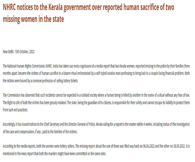 Kerala Human Sacrifice केरल के मानव बलि मामले में राष्ट्रीय मानवाधिकार आयोग (NHRC) ने केरल के मुख्य सचिव और DGP को नोटिस जारी किया है। राष्ट्रीय मानवाधिकार आयोग ने चार सप्ताह में पूरे मामले में रिपोर्ट मांगी है।