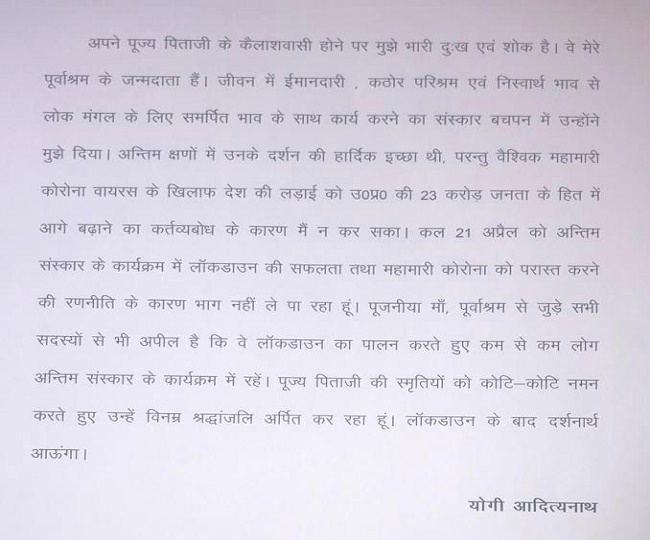 सीएम योगी आदित्यनाथ ने पिता के निधन पर शोक व्यक्त करते हुए परिवार से अपील की कि कम से कम अंतिम संस्कार में लोग शामिल हो। मैं लॉकडाउन समाप्त होने के बाद उनके दर्शनार्थ के लिए आऊंगा। उन्होंने कहा है कि वह कल पौड़ी में पिता के अंतिम संस्कार में नहीं जा रहे हैं। उनकी भी पिता के अंतिम दर्शन की इच्छा थी पर कोरोना की लड़ाई की वजह से वह ऐसा नहीं कर पा रहे। पूज्य पिताजी की स्मृतियों को कोटि-कोटि नमन करते हुए उन्हें विनम्र श्रद्धांजलि अर्पित कर रहा हूं। लॉकडाउन के बाद दर्शनार्थ आऊंगा।