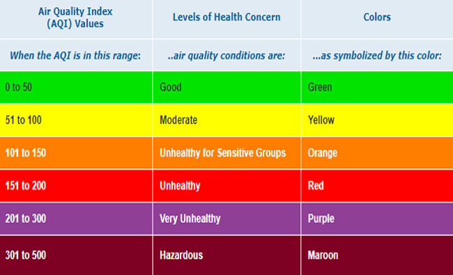 हवा की गुणवत्ता को छह भागों में बांटा जाता है। इस इंडेक्स को एयर क्वालिटी इंडेक्स (Air Quality Index) कहा जाता है। इस इंडेक्स के मुताबिक 0-50 की स्थिति सबसे अच्छी होती है, जिसमें घर से बाहर घूमना, खेलना या दूसरी एक्टीविटी करना अच्छा होता है। वहीं दूसरे नंबर पर 51-100 की श्रेणी आती है जिसको संतोषजनक माना जाता है। इस श्रेणी में सांस की तकलीफ होनी शुरू हो जाती है। तीसरे नंबर पर 101-200 के बीच आने वाली एयर क्वालिटी को रखा गया है। इसको मध्यम माना गया है, जिसमें फेंफड़े, अस्थमा और दिल के मरीजों को सांस लेने की तकलीफ बढ़ जाती है। चौथे नंबर पर 201-300 आती है, जो खराब की श्रेणी में है। इसमें सांस लेने की परेशानी काफी बढ़ जाती है। पांचवें नंबर पर 301-400 की श्रेणी है जो बेहद खराब एयर क्वालिटी को बताती है।