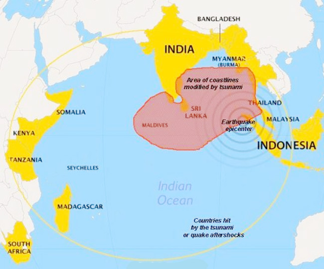 2004 में हिंद महासागर में आयी सुनामी ने न केवल लाखों लोगों की जान ली, बल्कि दुनिया का नक्शा भी बदलकर रख दिया है। भूगर्भ वैज्ञानिकों के अनुसार सुनामी की अपार ताकत से पृथ्वी का आकार थोड़ा बदल गया है। कुछ प्रायद्वीप अपने स्थान से कई-कई मीटर तक खिसक गए हैं। इससे दुनिया का नक्शा थोड़ा बदल गया है। टेक्टोनिक प्लेटों में टक्कर से हिंद महासागर का तल इंडोनेशिया की तरफ 15 मीटर खिसक गया है। इससे सुमात्रा के भूगोल में भी थोड़ा परिवर्तन हुआ है।