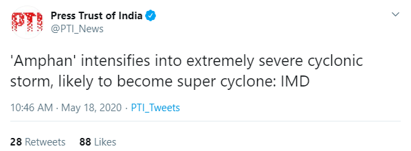 गृह मंत्रालय ने चक्रवाती तूफान 'एम्फन' के सोमवार शाम तक सुपर साइक्लोन में तब्दील होने की जानकारी देते हुए कहा है कि पश्चिम बंगाल और बांग्लादेश के तटों से यह तूफान बुधवार को टकराएगा। इस दौरान हवा की गति 185 किमी प्रति घंटे तक हो सकती है। चक्रवाती तूफान 'एम्फन' के मद्देनजर मौसम विभाग (IMD) ने ओडिशा, पश्चिम बंगाल, उप-हिमालयी पश्चिम बंगाल और सिक्किम, असम और मेघालय के लिए 21 मई तक भारी वर्षा की चेतावनी जारी की है।