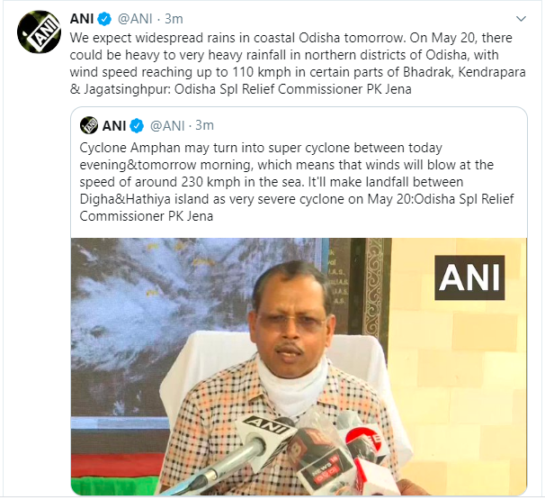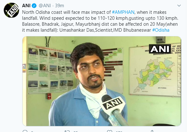 ओडिशा के विशेष राहत आयुक्त पीके जेना ने कहा कि एम्फन आज शाम से कल सुबह तक सुपर साइक्लोन में बदल सकता है। इसका मतलब है कि समुद्र में हवा 230 किलोमीटर प्रति घंटे से चलेगी। उन्होंने आगे बताया कि कल तटीय ओडिशा में मूसलधार बारिश की उम्मीद है। 20 मई को, ओडिशा के उत्तरी जिलों में भारी से बहुत भारी वर्षा हो सकती है। भद्रक, केंद्रपाड़ा और जगतसिंहपुर के कुछ हिस्सों में हवा की गति 110 किमी प्रति घंटे तक पहुंच सकती है। किसी भी स्थिति से निपटने के लिए पूरी तैयारी बै। रैपिड रेस्पॉन्स टीम, फायर टीमो, राष्ट्रीय आपदा प्रतिक्रिया (NDRF)को उन जिलों में भेज दिया है, जो इससे प्रभावित हो सकते हैं।