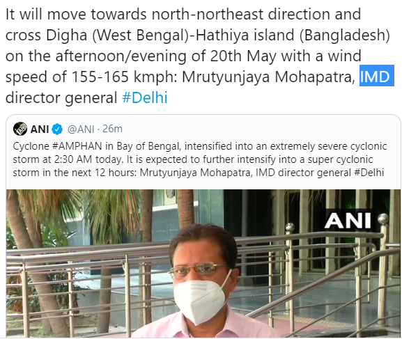 'एम्फन' उत्तर-उत्तरपूर्व की ओर बढ़ते हुए तेजी से बंगाल की खाड़ी के उत्तर-पश्चिम में बढ़ेगा और 20 मई की दोपहर/शाम के दौरान दीघा (पश्चिम बंगाल) और हातिया द्वीप समूह (बांग्लादेश) को पार करेगा। इस दौरान हवा की गति 155 से 165 किलोमीटर प्रति घंटा हो सकती है। समाचार एजेंसी एएनआइ के अनुसार भारतीय मौसम विभाग के महानिदेशक मृत्युंजय महापात्रा ने दी है।