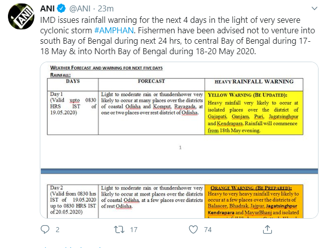 मछुआरों को अगले 24 घंटे के दौरान बंगाल की दक्षिणी खाड़ी में, 17-18 मई के दौरान बंगाल की केंद्रीय खाड़ी और 18-20 मई 2020 के दौरान बंगाल की उत्तरी खाड़ी में नहीं जाने की सख्त हिदायत दी गई है।