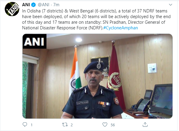 चक्रवात 'एम्फन' के मद्देनजर राष्ट्रीय आपदा प्रतिक्रिया बल (एनडीआरएफ) ने किसी भी परिस्थिति से निपटने के लिए अपनी 10 टीमों को ओडिशा और अपनी सात टीमों को पश्चिम बंगाल भेजा है।