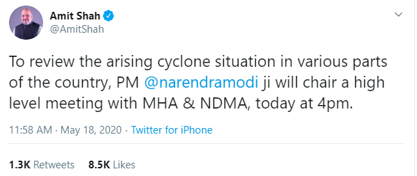 प्रधानमंत्री नरेंद्र मोदी ने देश के विभिन्न हिस्सों में चक्रवाती तूफान Amphan से उत्पन्न स्थिति की समीक्षा करने के लिए गृह मंत्रालय (MHA) और राष्ट्रीय आपदा प्रबंधन प्राधिकरण (NDMA) के अधिकारियों के साथ बैठक की। गृह मंत्री अमित शाह भी बैठक में मौजूद रहे।