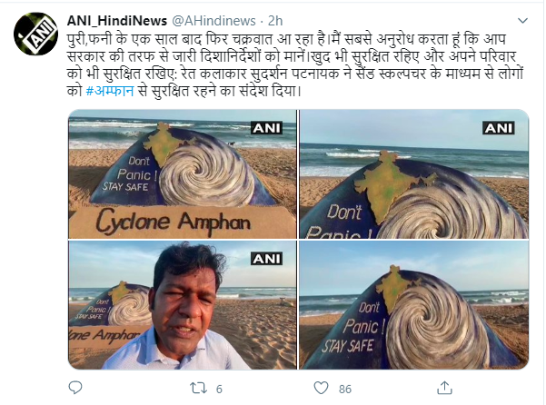 रेत कलाकार सुदर्शन पटनायक ने सैंड स्कल्पचर के माध्यम से लोगों को से सुरक्षित रहने का संदेश दिया। समाचार एजेंसी एएनआइ के अनुसार उन्होंने कहा, ' फनी के एक साल बाद फिर चक्रवात आ रहा है।मैं सबसे अनुरोध करता हूं कि आप सरकार की तरफ से जारी दिशानिर्देशों को मानें।खुद भी सुरक्षित रहिए और अपने परिवार को भी सुरक्षित रखिए।'