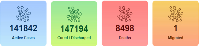 राज्य में पिछले 24 घंटों में कोरोना वायरस के 141 नए मामले सामने आए हैं। कोरोना वायरस पॉजिटिव मामलों की कुल संख्या बढ़कर 4,402 हो गई है जिसमें 1,723 सक्रिय मामले और 80 मौतें शामिल हैं: राज्य स्वास्थ्य विभाग