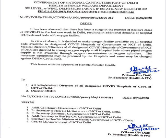 दिल्ली सरकार ने सभी कोरोना अस्पतालों को अपने सभी बेड पर ऑक्सीजन की सुविधा उपलब्ध कराने का निर्देश जारी किया है। पिछले एक हफ्ते में दिल्ली में पॉजिटिव मामलों में वृद्धि को देखते हुए यह निर्णय लिया गया है।