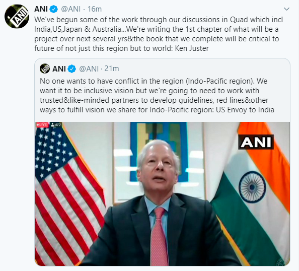 भारत में अमेरिकी राजदूत केनेथ जस्टर ने कहा, 'कोई भी इस क्षेत्र (इंडो-पैसिफिक क्षेत्र) में संघर्ष नहीं चाहता है। हम चाहते हैं कि यह समावेशी दृष्टि हो, लेकिन हम इंडो-पैसिफिक क्षेत्र के लिए साझा किए गए दिशा-निर्देशों, लाल रेखाओं और अन्य तरीकों को विकसित करने के लिए विश्वसनीय और समान विचारधारा वाले भागीदारों के साथ काम करने जा रहे हैं।'