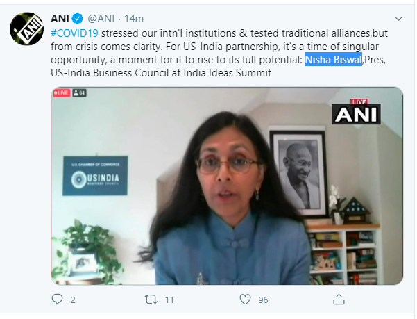 यूएसआइबीसी की अध्यक्ष निशा बिस्वाल ने कहा कि कोरोना वायरस ने हमारे अंतररार्ष्ट्रीय संस्थानों पर प्रभाव डाला है और पारंपरिक गठबंधनों का परीक्षा लिया है, लेकिन संकट से स्पष्टता आती है। भारत-अमेरिका साझेदारी के लिए यह एक अवसर का समय है।