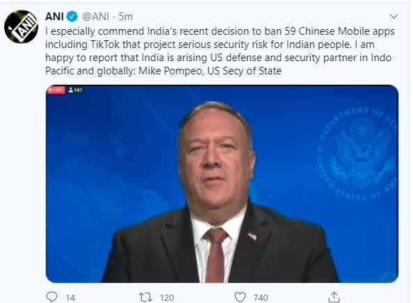 प्रधानमंत्री नरेंद्र मोदी के संबोधन से पहले अमेरिकी विदेश मंत्री माइक पोंपियो ने इंडिया आइडियाज समिट (India Ideas Summit) में कहा कि अमेरिका ने पीएम मोदी को अगले जी 7 शिखर सम्मेलन में आमंत्रित किया है, जहां हम अंतरराष्ट्रीय समृद्धि तंत्र को आगे बढ़ाएंगे। उन्होंने कहा, 'हम दुनिया के सबसे पुराने और सबसे समृद्ध लोकतंत्र हैं और यह महत्वपूर्ण है कि हमारे जैसे लोकतंत्र एक साथ काम करें। भारत इंडो-पैसिफिक और विश्व में अमेरिका का उभरता हुआ रक्षा साझेदार है। उन्होंने यह भी कहा, 'मैं विशेष रूप से टिकटॉक सहित 59 चीनी मोबाइल ऐप पर प्रतिबंध लगाने के भारत के हालिया फैसले की सराहना करता हूं, जो भारतीय लोगों के लिए गंभीर सुरक्षा जोखिम पेश करते हैं।'