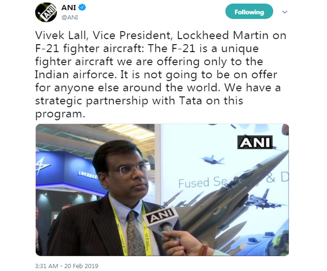 अत्याधुनिक F-21 लड़ाकू विमानों का भारत में उत्पादन करने की घोषणा अमेरिकी रक्षा एवं एयरोस्पेस कंपनी लॉकहीड मार्टिन ने की है। कंपनी ने ये घोषणा बुधवार को बेंगलुरू में आयोजित ‘एयरो इंडिया 2019’ शो के पहले दिन की है। इस शो में कंपनी ने अपने F-21 फाइटर जेट का प्रदर्शन भी किया है। इस दौरान कंपनी ने बताया कि उन्होंने इस विमान को विशेष तौर पर भारतीय वायुसेना के लिए डिजाइन किया है।