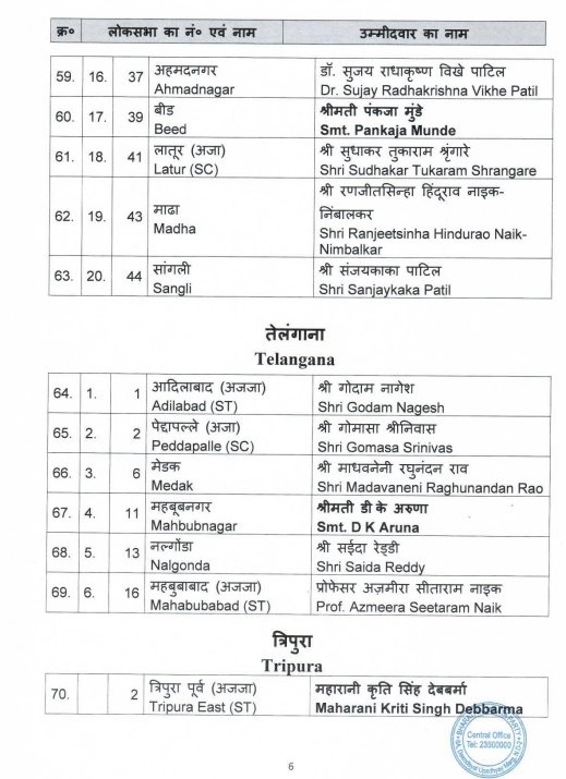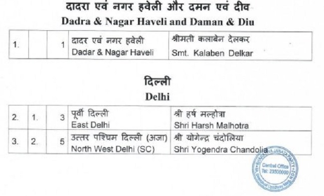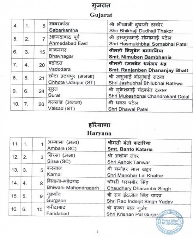 दूसरी लिस्ट में दिल्ली, उत्तराखंड और हिमाचल की दो-दो, गुजरात की सात, हरियाणा की छह, कर्नाटक और महाराष्ट्र की 20-20, मध्य प्रदेश की पांच, तेलंगाना की छह, दमन एवं द्वीप और त्रिपुरा की एक-एक सीट पर प्रत्याशी उतारा है।