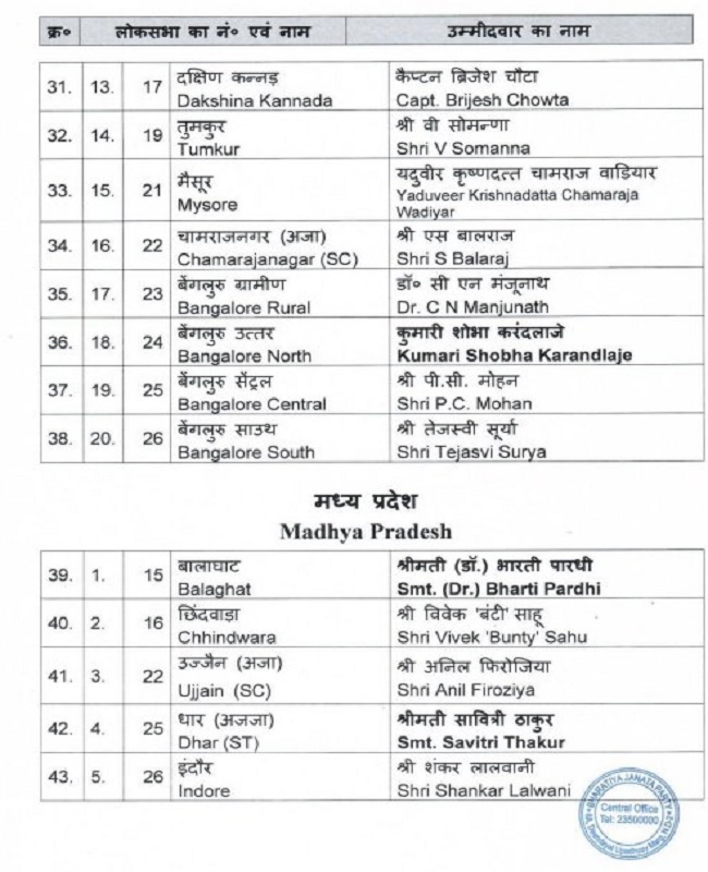 भाजपा ने होल्ड पर रखी गई पांच सीटों पर भी प्रत्याशियों का एलान कर दिया है। पहली सूची में 29 में से 24 उम्मीदवारों के नाम शामिल थे और इस बार पार्टी ने शेष बची पांच सीटों पर भी उम्मीदवार उतार दिए। बालाघाट से भारती पारधी, छिंदवाड़ा से विवेक बंटी साहू, उज्जैन से अनिल फिरोजिया, धार से सावित्री ठाकुर और छिंदवाड़ा से शंकर लालवानी को उम्मीदवार बनाया है।