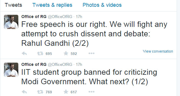 कांग्रेस उपाध्यक्ष ने इस पूरे मामले की आलोचना करते हुए ट्वीट कर कहा कि मोदी सरकार की आलोचना के चलते आइआइटी कैंपस में स्टूडेंट ग्रुप को बैन कर दिया गया। अगला कदम क्या होगा यह देखना होगा। अभिव्यक्ति की आजादी हमारा हक है। यदि कोई इसको दबाने की कोशिश करता है तो कांग्रेस उसका पुरजोर विरोध करेगी। एपीसी ग्रुप की मान्यता प्रधानमंत्री नरेंद्र मोदी की आलोचना किए जाने के बाद रद की गई है जिसे आइआइटी ने सही कदम बताया है।