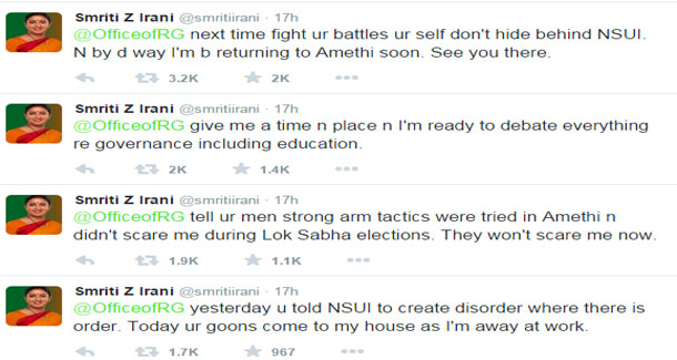 इसका जवाब देते हुए ईरानी ने ट्विटर पर अपनी टिप्पणियों में कहा, ‘अगली बार अपनी लड़ाई खुद लड़ें, एनएसयूआइ के पीछे न छिपें। और वैसे भी मैं जल्द अमेठी लौट रही हूं। वहां आपसे मिलूंगी।’ ईरानी ने राहुल को चुनौती देते हुए कहा, ‘मुझे समय और स्थान बताइए। मैं शिक्षा सहित शासन के हर पहलू पर बात करने को तैयार हूं।’ उन्होंने यह भी कहा, ‘कल आपने एनएसयूआइ से कहा कि जहां कहीं व्यवस्था है वहां अव्यवस्था पैदा करें। आज आपके गुर्गे मेरे घर आए जब मैं काम पर गई हुई थी।’ ।