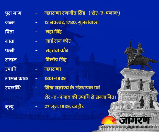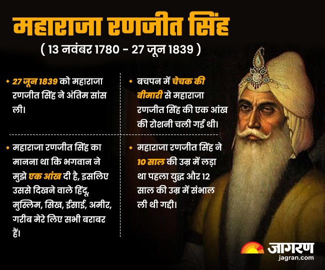 नई दिल्ली, ऑनलाइन डेस्क। महाराजा रणजीत सिंह का जन्म पंजाब के गुजरांवाला (अब पाकिस्तान) में 13 नवंबर 1780 को हुआ था। पंजाब के शेर या शेर-ए-पंजाब के नाम से प्रसिद्ध महाराजा रणजीत सिंह महान शासक और महान योद्धा पंजाब के सिख साम्राज्य के संस्थापक थे। राजा रणजीत सिंह का राज्य उत्तर-पश्चिम में खैबर दर्रे से लेकर पूर्व में सतलुज नदी तक और भारतीय उपमहाद्वीप के सबसे उत्तरी क्षेत्र कश्मीर से लेकर दक्षिण में थार (महान भारतीय) रेगिस्तान तक फैली हुई थी। पंजाब राज्य एकमात्र ऐसा राज्य है जिसने अफगानिस्तान को हराया है।