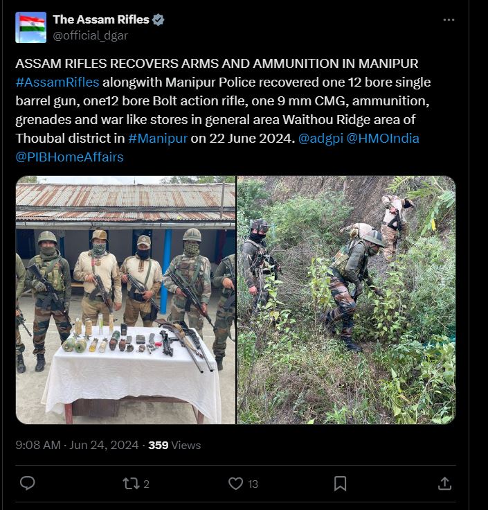 असम राइफल्स की ओर से जारी आधिकारिक बयान में कहा गया है, 'मणिपुर के थौबल जिले के वेथौ रिज क्षेत्र में हथियारों और गोला-बारूद की मौजूदगी की विशेष खुफिया सूचना के आधार पर कार्रवाई करते हुए असम राइफल्स और मणिपुर पुलिस ने एक संयुक्त अभियान चलाया और एक 12 बोर सिंगल बैरल बंदूक, एक 12 बोर बोल्ट एक्शन राइफल, एक 9 एमएम सीएमजी, गोला-बारूद, ग्रेनेड और युद्ध संबंधी सामान बरामद किया।'