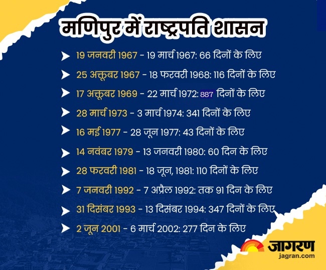 - पहली बार राष्ट्रपति शासन 19 जनवरी, 1967 से 19 मार्च, 1967 तक 66 दिन के लिए लगाया गया था। उस समय मणिपुर केंद्र शासित विधानसभा का पहला चुनाव होना था।