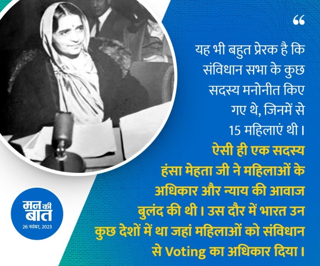 पीएम मोदी ने बताया कि संविधान सभा के कुछ सदस्य मनोनीत किए गए थे, जिसमें से 15 महिलाएं थीं। ऐसी ही एक महिला हंसा मेहता जी ने महिलाओं के अधिकारों की बात की थी।