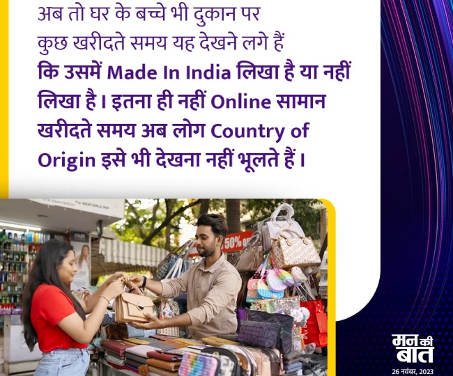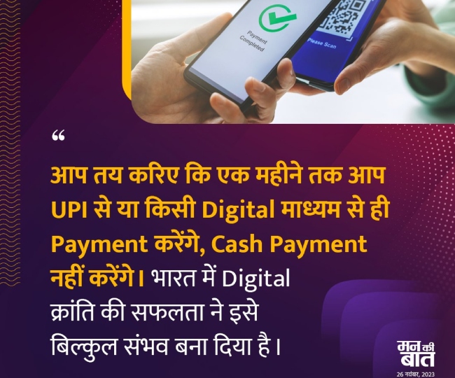 पीएम मोदी ने कहा कि ये लगातार दूसरा साल है, जब दीपावली के अवसर में कैश देकर कुछ सामान खरीदने का प्रचलन धीरे-धीरे-धीरे कम होता जा रहा है। अब लोग ज्यादा से ज्यादा डिजिटल पेमेंट कर रहे हैं। ये भी बहुत उत्साह बढ़ाने वाला है।