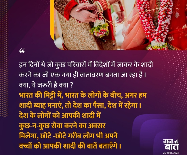 पीएम मोदी ने विदेश में जाकर शादी करने वालों से सवाल किया। उन्होंने कहा कि इन दिनों कुछ परिवारों ने विदेशों में जाकर शादी करने शुरू किया है। इससे एक नया वातावरण बनता जा रहा है। क्या ये जरूरी है? भारत की मिट्टी में, भारत के लोगों के बीच, अगर हम शादी ब्याह मनाएं, तो देश का पैसा, देश में रहेगा।