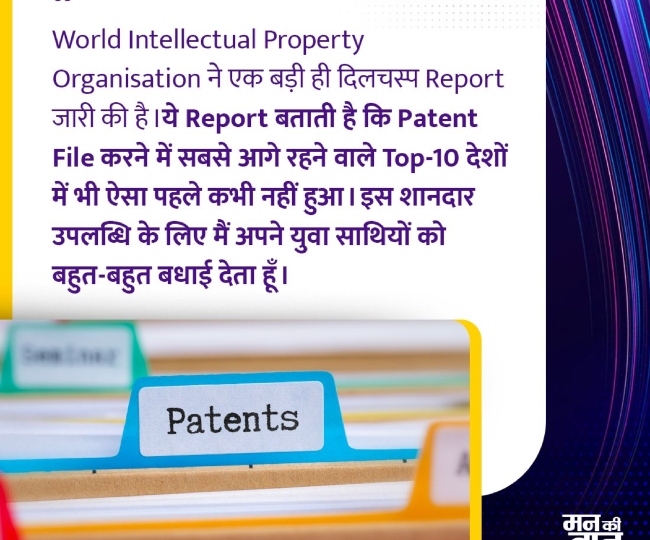 इंटेलिजेंस, आइडिया और इनोवेशन आज भारतीय युवाओं की पहचान है। प्रौद्योगिकी के संयोजन से उनकी बौद्धिक संपदा में निरंतर प्रबलता हो, ये आपके अपने देश की दृढ़ता को बढ़ाने वाली महत्वपूर्ण प्रगति है। आपको ये जानकर अच्छा लगेगा कि 2022 में भारतीयों के पेटेंट आवेदन में 31 प्रतिशत से ज्यादा की बढ़ोतरी हुई है।